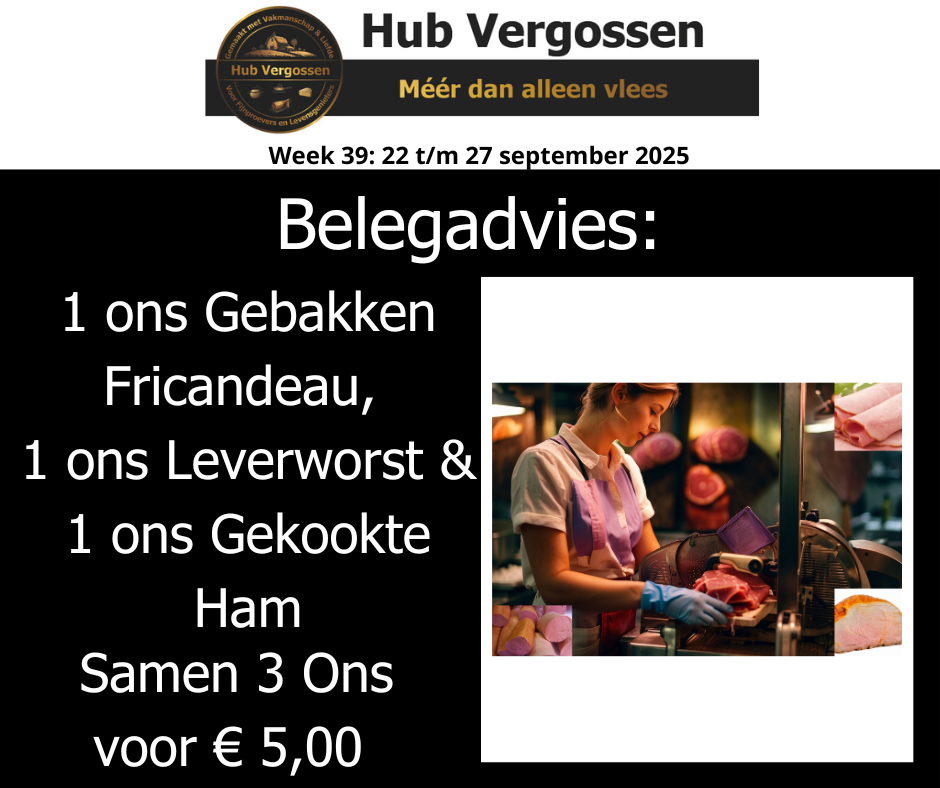 Belegadvies: 1 ons Gebakken Fricandeau, 1 ons Leverworst & 1 ons Gekookte Ham, Samen 3 ons voor € 5,00